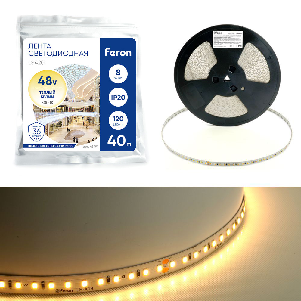 48791 - Лента светодиодная стабилизированная 120SMD(2835)/м 8Вт/м 48V 40000*10*1.22мм 3000К, IP20 LS420 FERONВ наличии