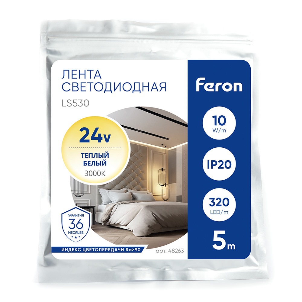 48263 - Светодиодная COB лента Feron LS530, 320SMD(2110) 10Вт/м 24V 5000*8*1.8мм 3000К IP20В наличии