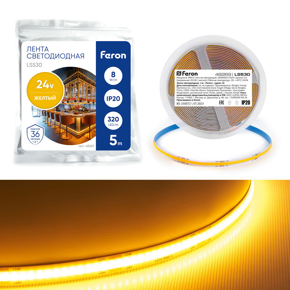 48269 - Светодиодная COB лента Feron LS530 320SMD(2110) 8Вт/м 24V 5000*8*1.8мм IP20, желтыйВ наличии