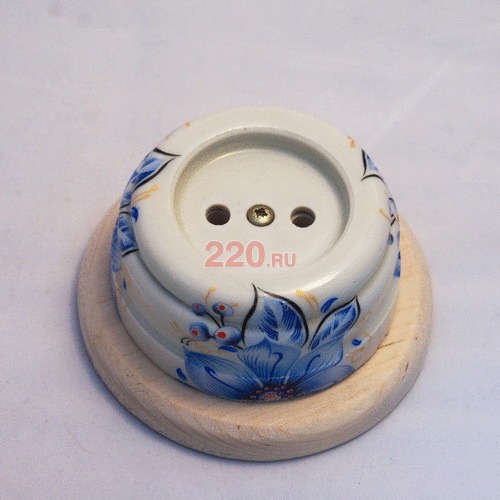 Корпус ретро розетки — электрофарфор, покрытие — глазурь (рисунок Лазурный). Круглая подложка из светлого дерева.