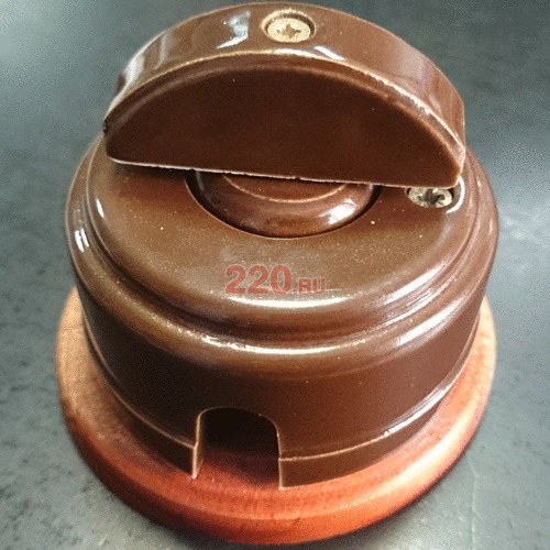 Роторный (поворотный) на 2 нагрузки (схема 5, как «двухклавишный»). Ручка-вентиль — керамический полукруг. Материал корпуса — электрофарфор, покрытие — глазурь. Круглая подложка из тёмного дерева. Цион.